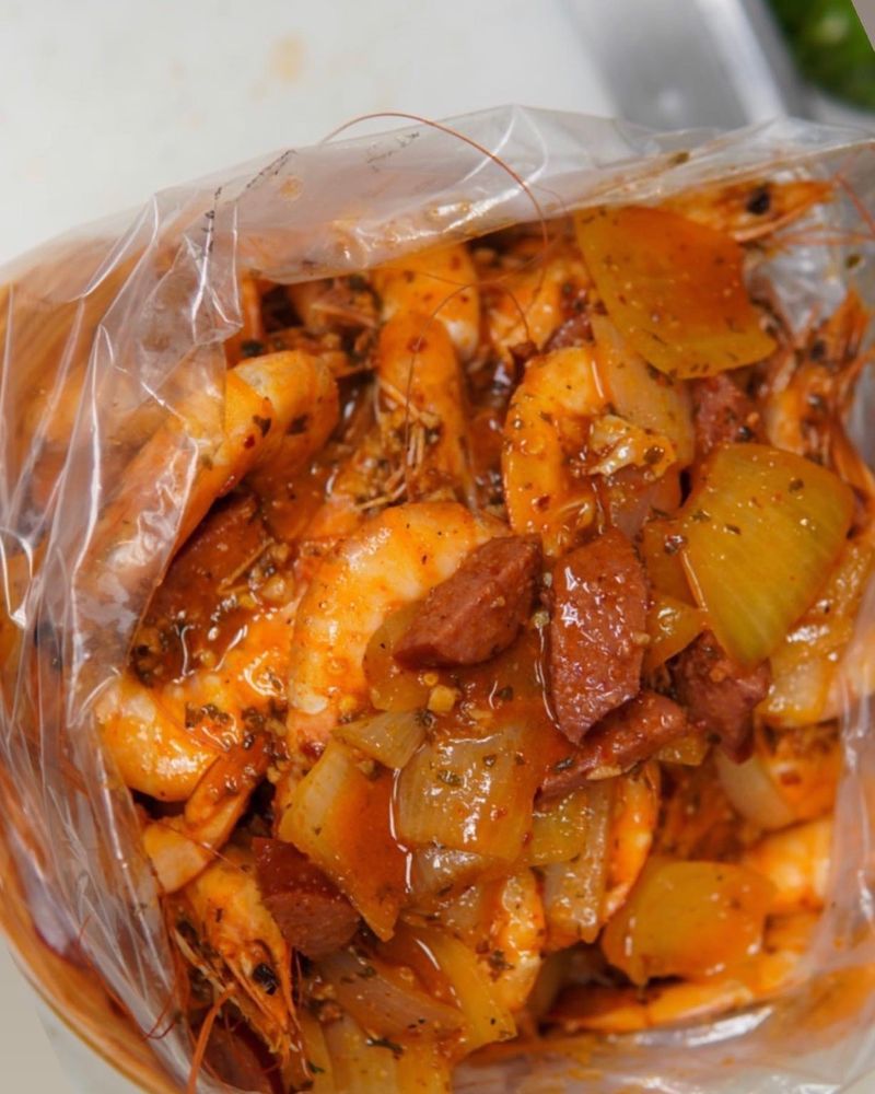 Bag with 1 pound of shrimp, corn, onion, and potato and your favorite sauce.